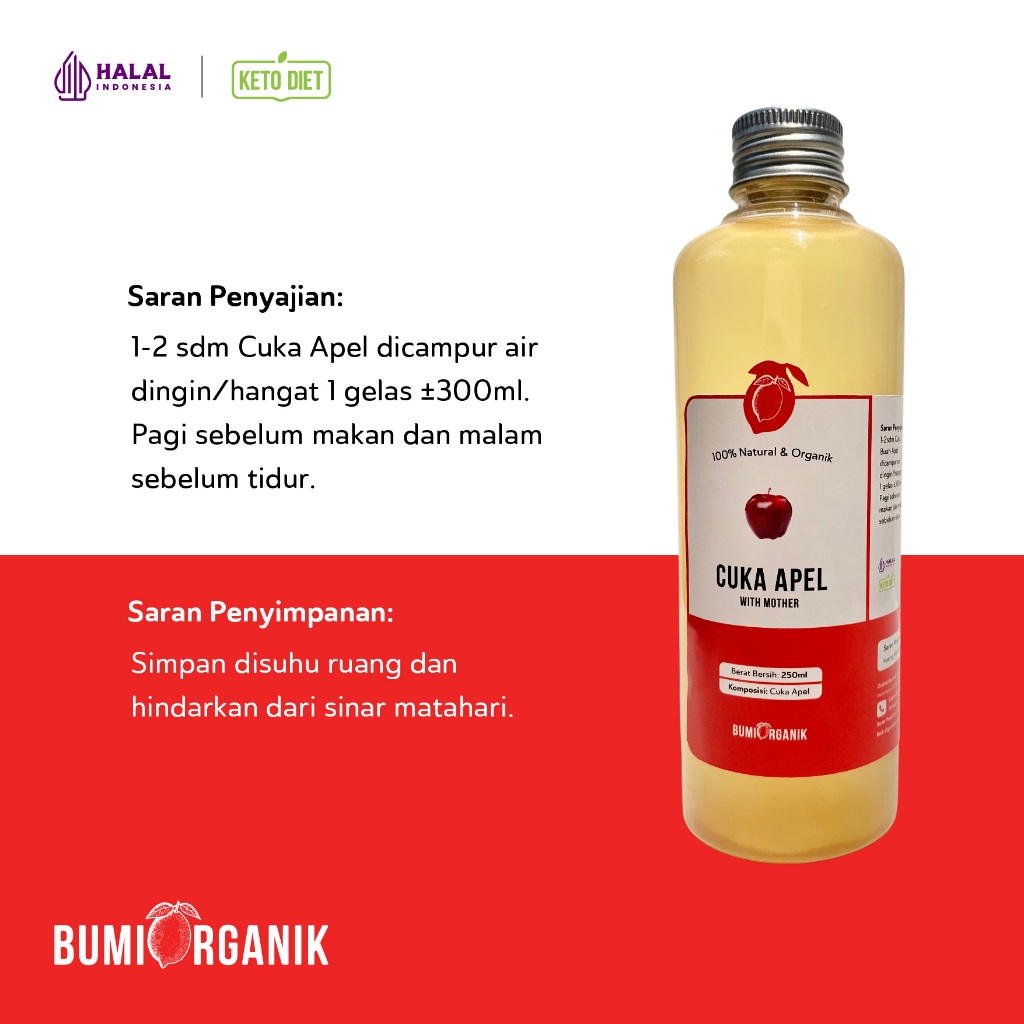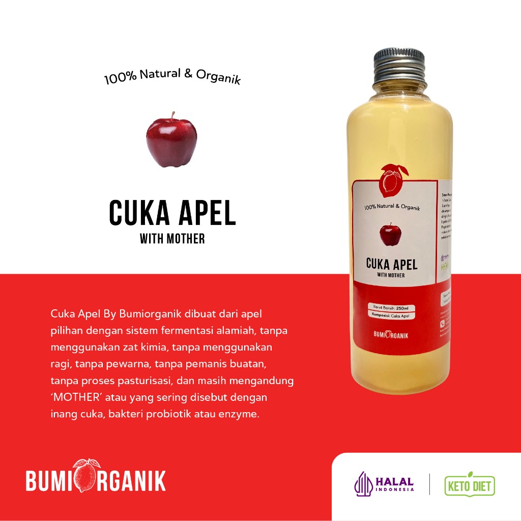 Cuka apel, atau dikenal juga sebagai apple cider vinegar (ACV), adalah cuka yang dibuat dari fermentasi jus apel. Proses pembuatannya melibatkan fermentasi alkohol dan asam, di mana gula dalam apel diubah menjadi alkohol oleh ragi, dan kemudian alkohol tersebut diubah menjadi asam asetat oleh bakteri. Asam asetat inilah yang memberikan cuka apel rasa asam dan bau khasnya.