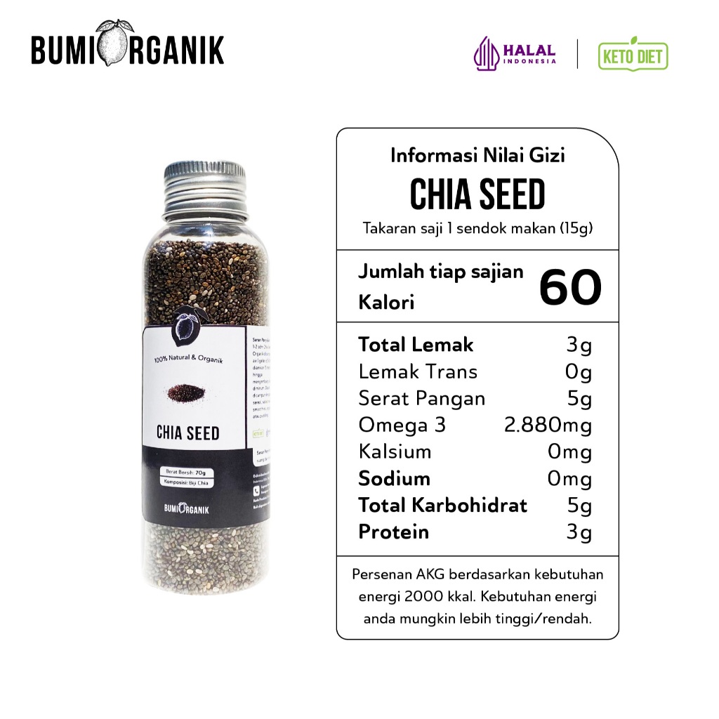 Temukan keajaiban alami Chia Seed dari Bumi Organik dalam setiap gigitannya. Chia Seed, yang berasal dari tanaman Salvia hispanica, adalah sumber nutrisi yang kaya akan serat, protein, omega 3 asam lemak, serta mineral esensial seperti kalsium, magnesium, dan fosfor.
