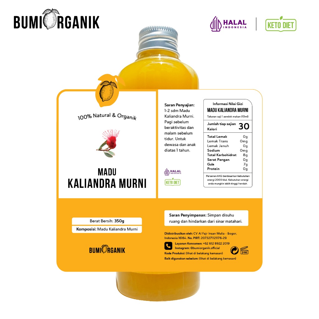 Madu Kaliandra Bumi Organik diambil dari nektar bunga Kaliandra yang dipanen dari sarang lebah ternak Apis mellifera di daerah Sumenep, Madura. Tinggi glukosa dan memiliki aroma khas. Bermanfaat untuk menjadikan tidur lebih berkualitas, menyembuhkan luka bakar, meningkatkan daya tahan tubuh dan antikanker.