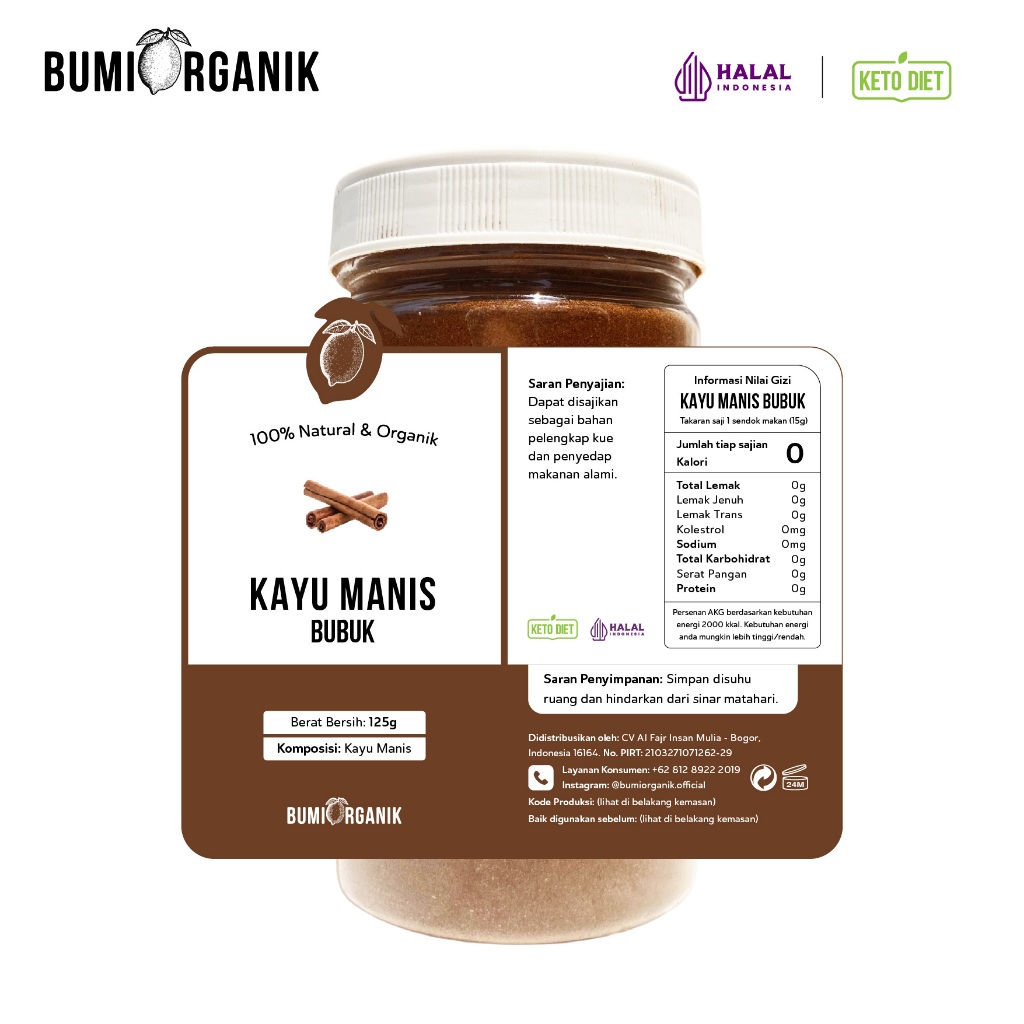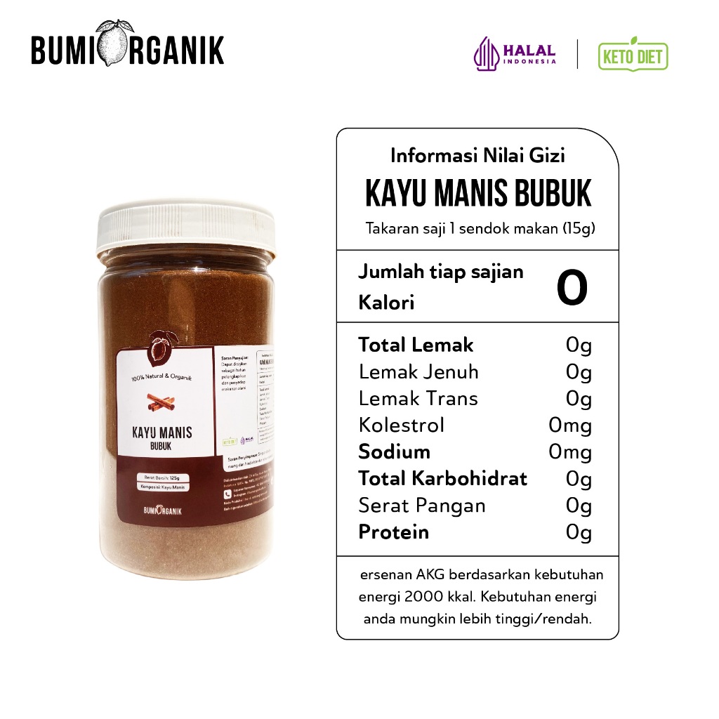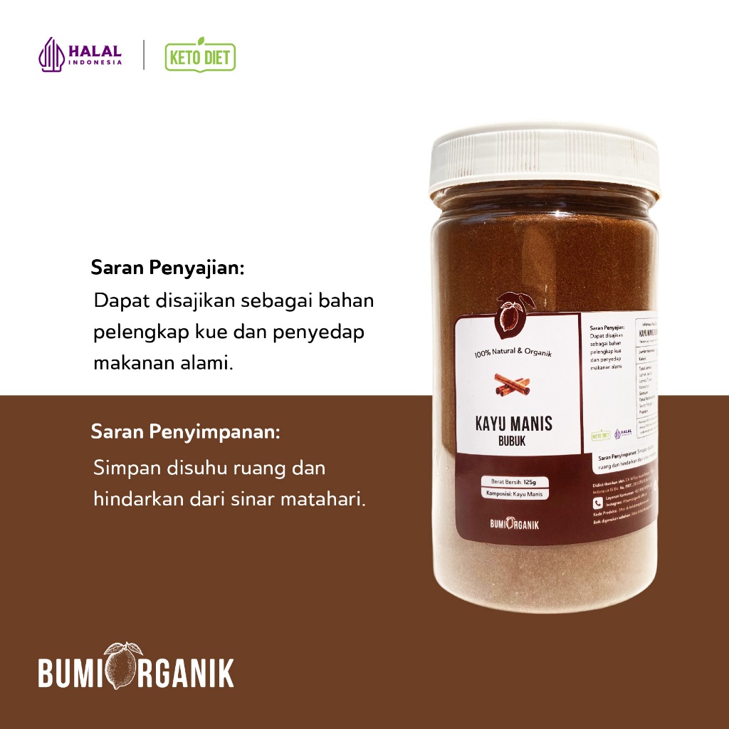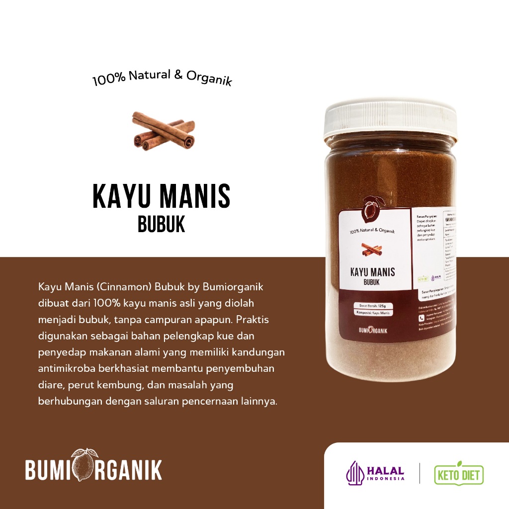Kayu Manis (Cinnamon) Bubuk by Bumi Organik dibuat dari 100% kayu manis asli yang diolah menjadi bubuk, tanpa campuran apapun. Praktis digunakan sebagai bahan pelengkap kue dan penyedap makanan alami yang memiliki kandungan antimikroba berkhasiat membantu penyembuhan diare, perut kembung, dan masalah yang berhubungan dengan saluran pencernaan lainnya.
