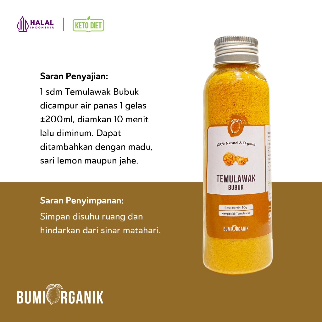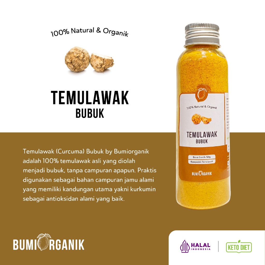 Temulawak (Curcuma) Bubuk by Bumi Organik adalah 100% temulawak asli yang diolah menjadi bubuk, tanpa campuran apapun. Praktis digunakan sebagai bahan campuran jamu alami yang memiliki kandungan utama yakni kurkumin sebagai antioksidan alami yang baik.